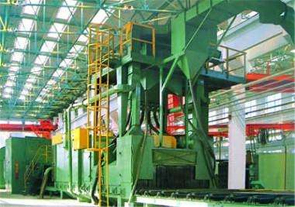 輥道式拋丸機工作過程: 輥道式拋丸機清理過程中由電氣控制的可調速輸送輥道將鋼結構件或鋼材送進清理機室體內拋射區,輥道式拋丸機其周身各面受到來自不同坐標方位的強力密集彈丸打擊與磨擦,使之其上的氧化皮、銹層及其污物迅速脫落,鋼材表面就獲得一定粗糙度的光潔表面,在輥道式拋丸機清理室外兩邊進出口輥道裝卸工件,落入鋼材上面的彈丸與銹塵經吹掃裝置吹掃,撒落下來的丸塵混合物由回收螺旋輸送到室體漏斗、縱橫向螺旋輸送機匯集于提升機下部,再提升到輥道式拋丸機機器上部的分離器里,分離后的純凈彈丸落入分離器料斗中內,供拋丸循環使用。輥道式拋丸機拋丸清理中產生塵埃,由抽風管送向除塵系統,凈化處理后的凈氣排放到大氣中,顆粒狀塵埃被捕捉收集。